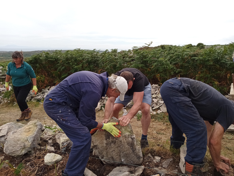 Gwirfoddolwyr y Bartneriaeth yn atgyweirio waliau cerrig sych yn Y Lleiniau, Llaingoch